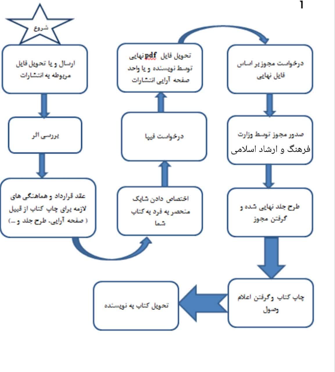 پرینت کتاب به همراه سی دی برای گرفتن مجوز به وزارت ارشاد تحویل داده می شود و با توجه به موضوع ۱ هفته الی ۲ ماه مجوز کتاب صادر می شود. و اگر مواردی نیازمند اصلاح باشد به اطلاع نویسنده می رسد و بعد از انجام اصلاحات مجوز صادر می شود.